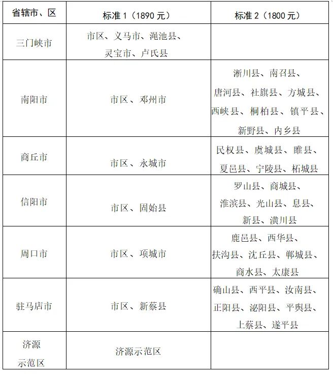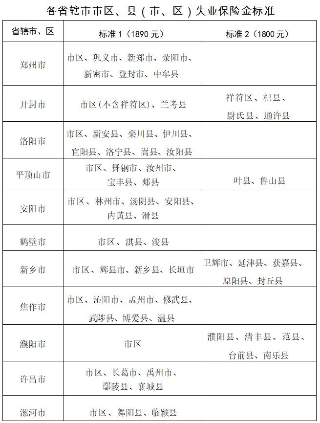 失业保险金基本标准按照全省一类行政区域最低工资标准的百分之九十确定,调整为1890元/月。其中,失业保险金基本标准高于最低工资标准的三类行政区域,失业保险金标准按照不高于所在地最低工资标准确定,调整为1800元/月。纳入省直统筹的失业保险参保单位失业保险金标准,参照郑州市市区标准执行。