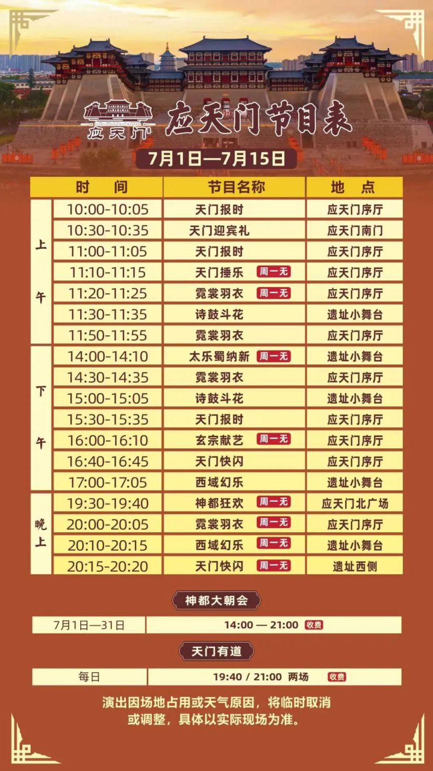 #应天门 "节目单:" 1. "开城仪式" - 09:00-09:30 2. "古风舞蹈表演" - 10:00-10:30 3. "唐代武术表演" - 11:00-11:30 4. "宫廷乐舞" - 14:00-14:30 5. "夜游应天门" - 18:00-19:00