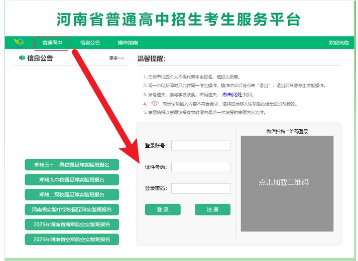 九年级考生在导航中点击“普通高中”,进入考生登录界面。
